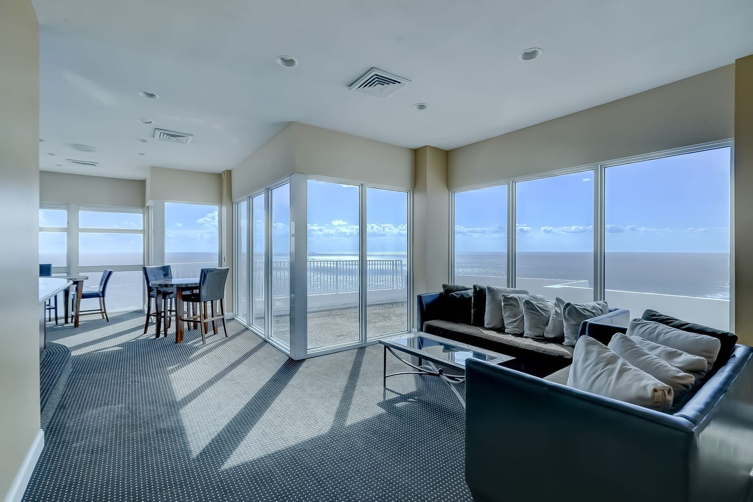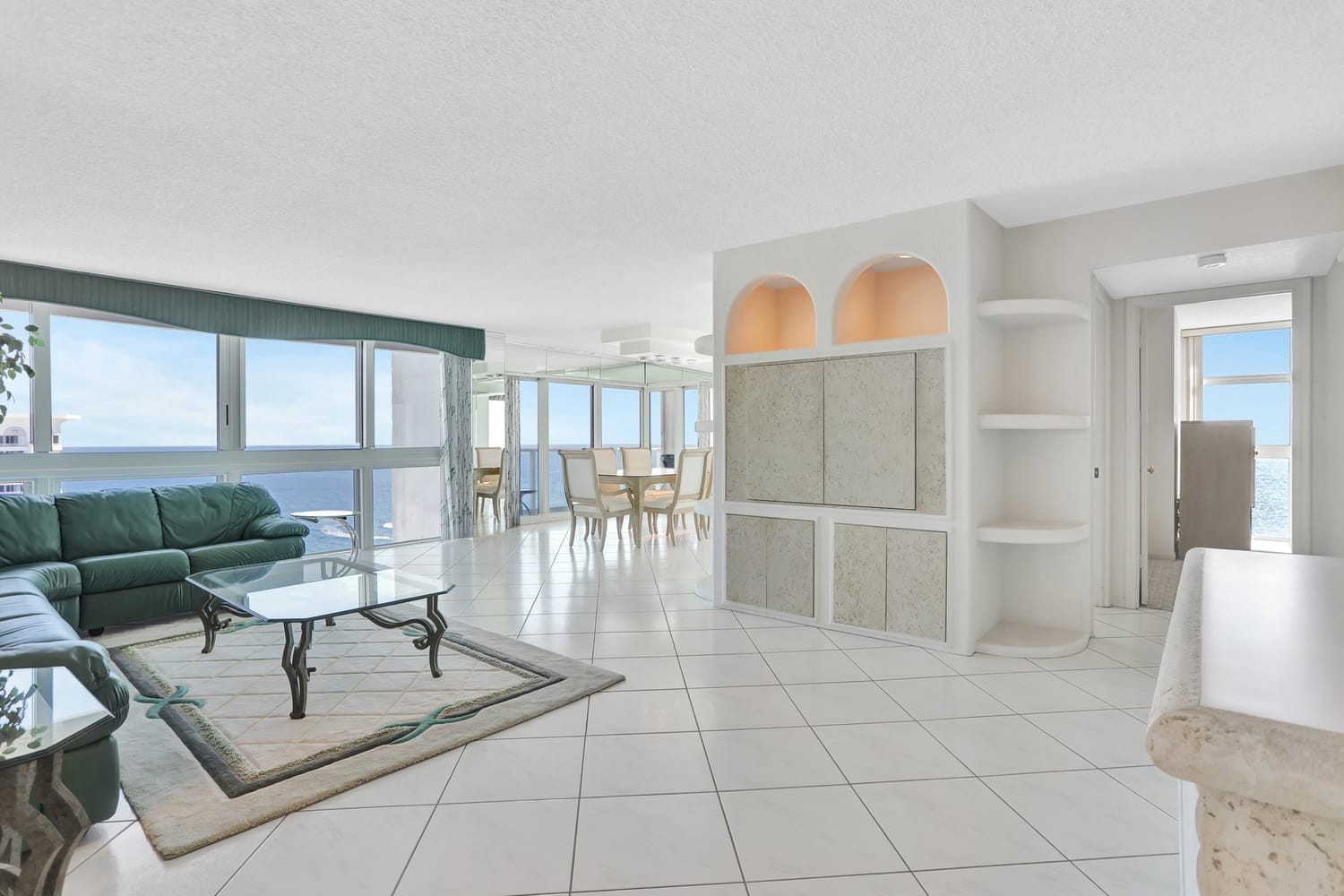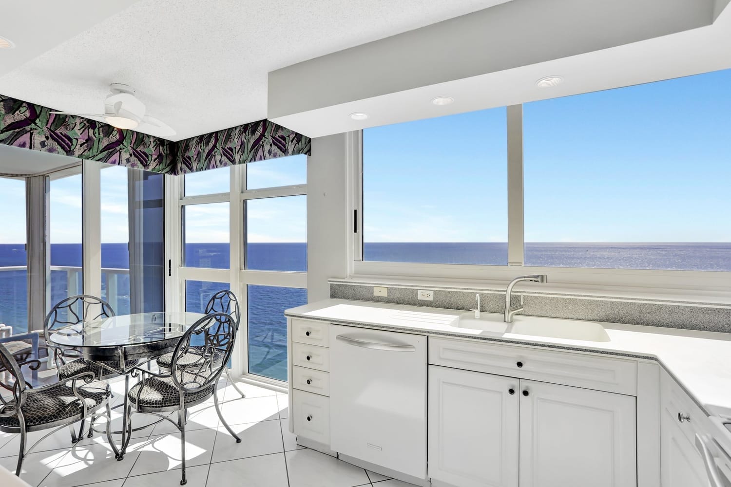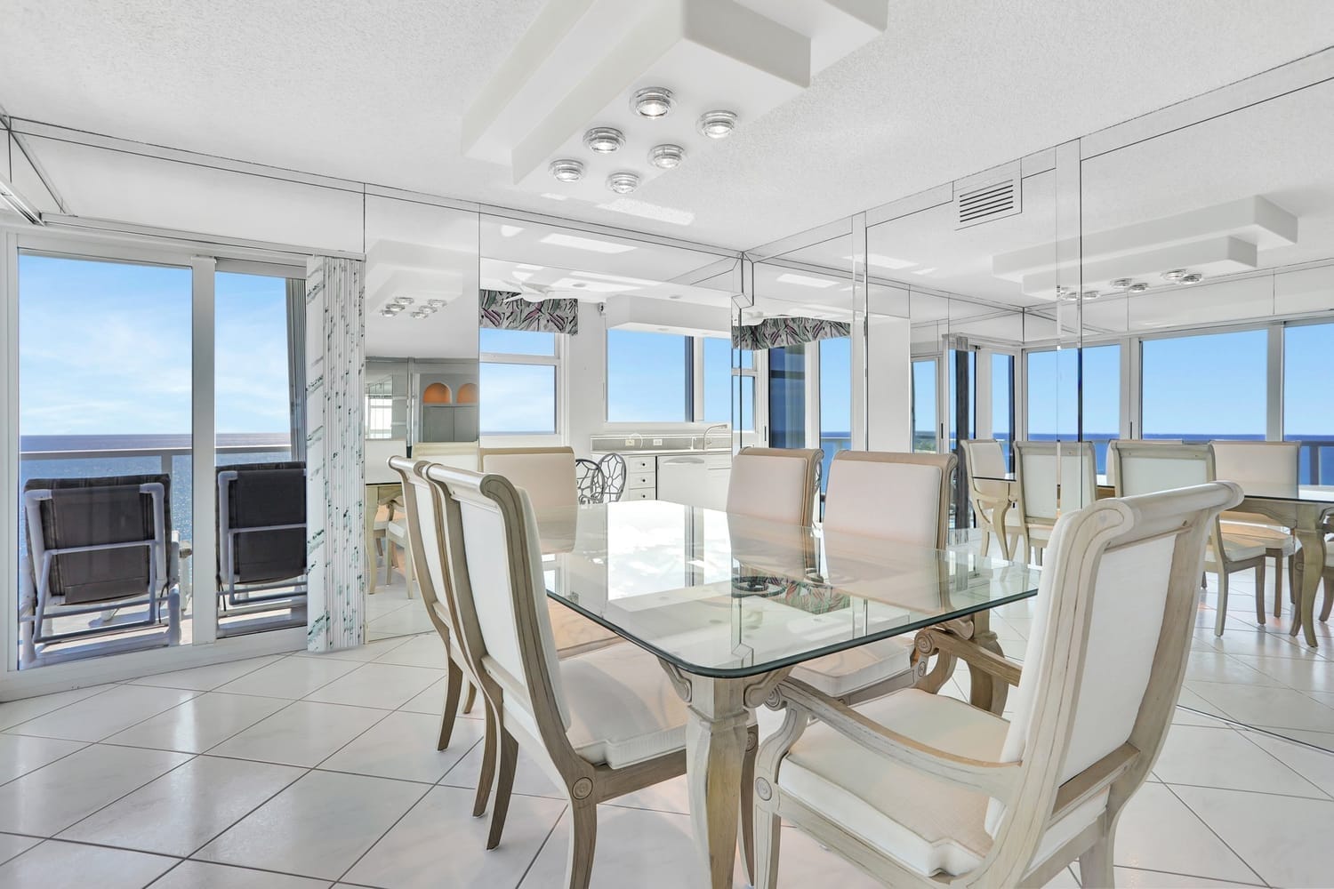 This rarely available 2-bedroom, 2.5-bath corner unit offers direct, unobstructed views of the Atlantic Ocean, this expansive 1,652 sq ft residence truly feels like you're living on a cruise ship—surrounded by water, with the horizon stretching endlessly ahead from every room. Lots of natural light pours in through hurricane-impact windows, showcasing the white ceramic tile floors throughout the living spaces and drawing your eyes out toward the wraparound balcony and up toward the Atlantic Ocean.