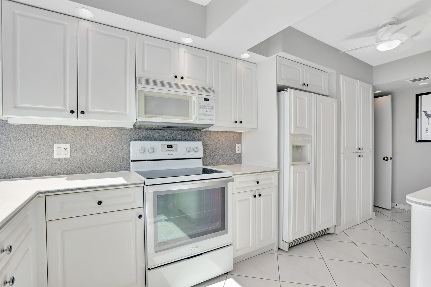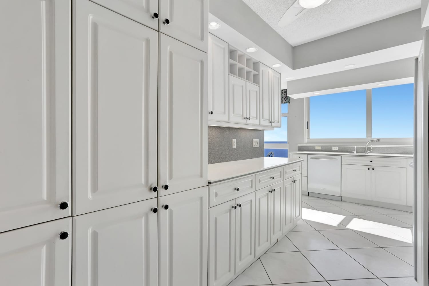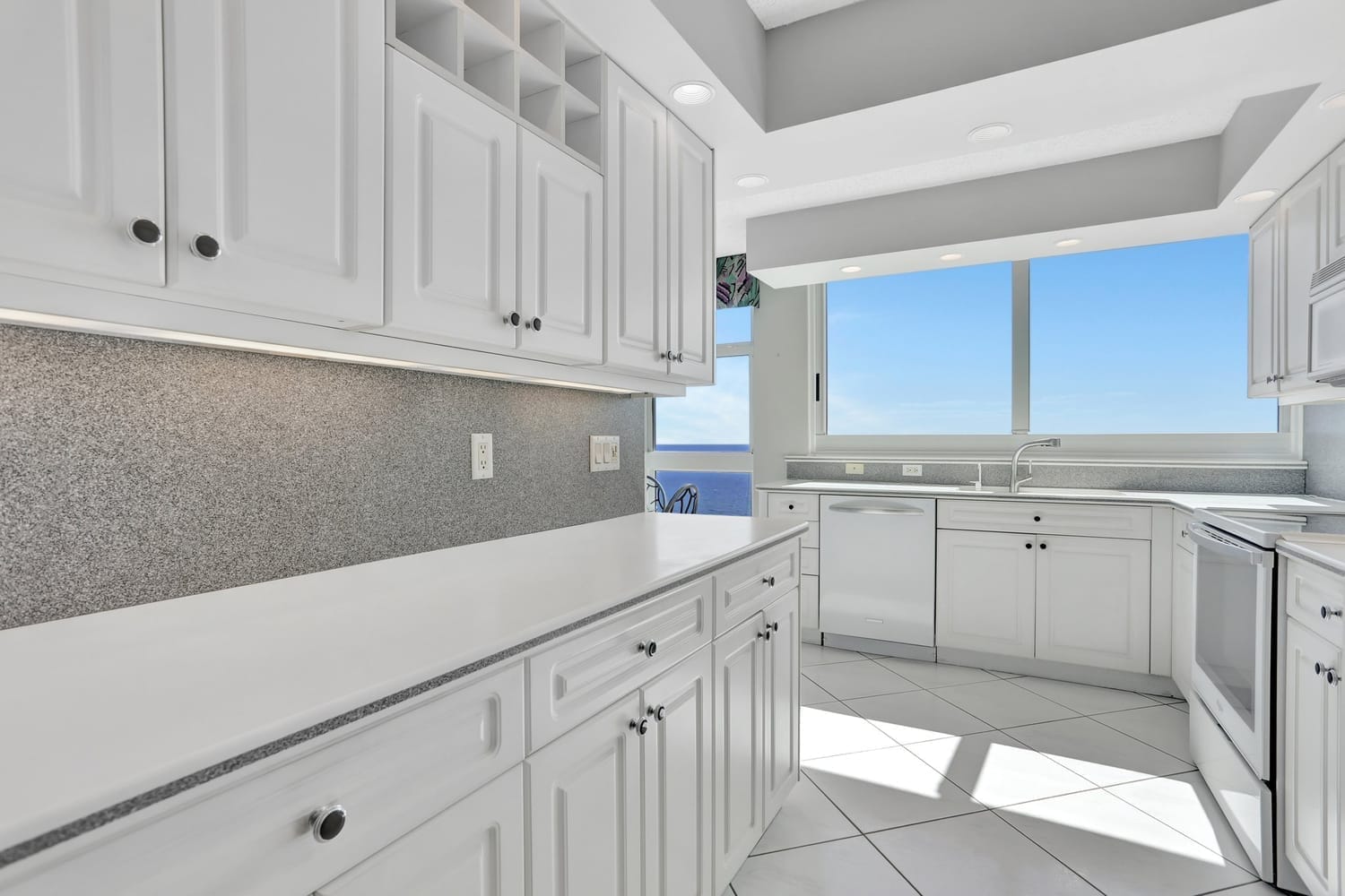 The kitchen is light, bright, and full of potential with classic white cabinetry, recessed lighting, and plenty of storage. There’s even a charming breakfast nook that feels like a private perch over the ocean—perfect for morning coffee or late-night reflections. Off the kitchen, you’ll also find a tucked-away stacked washer and dryer, adding convenience without sacrificing space.