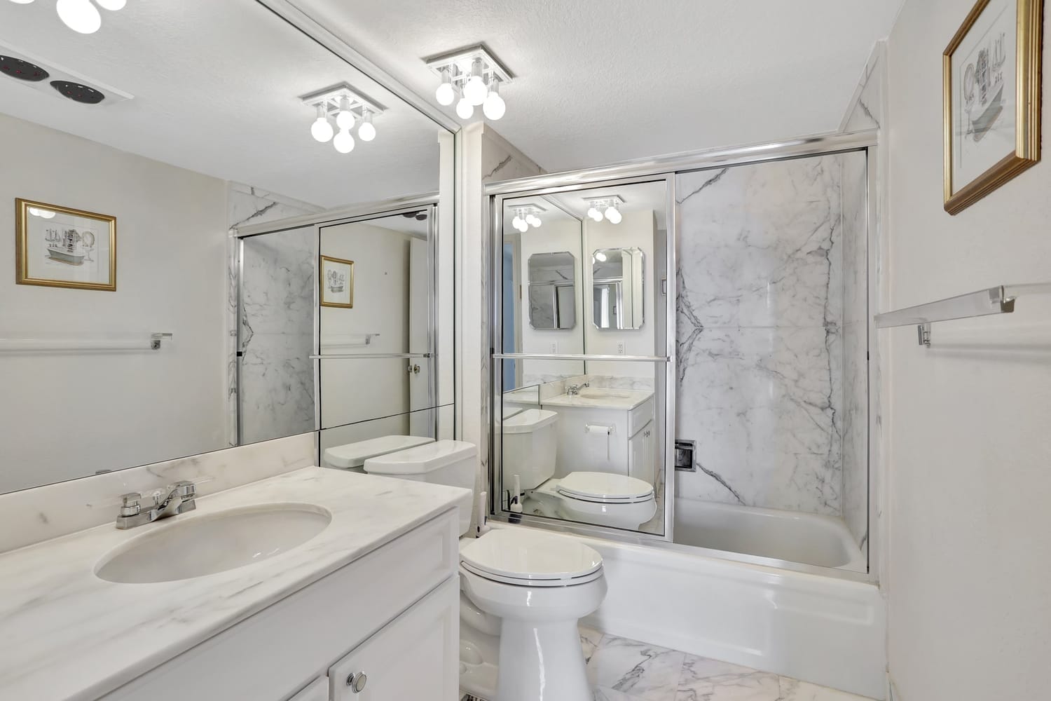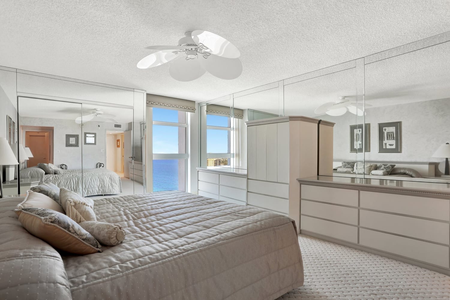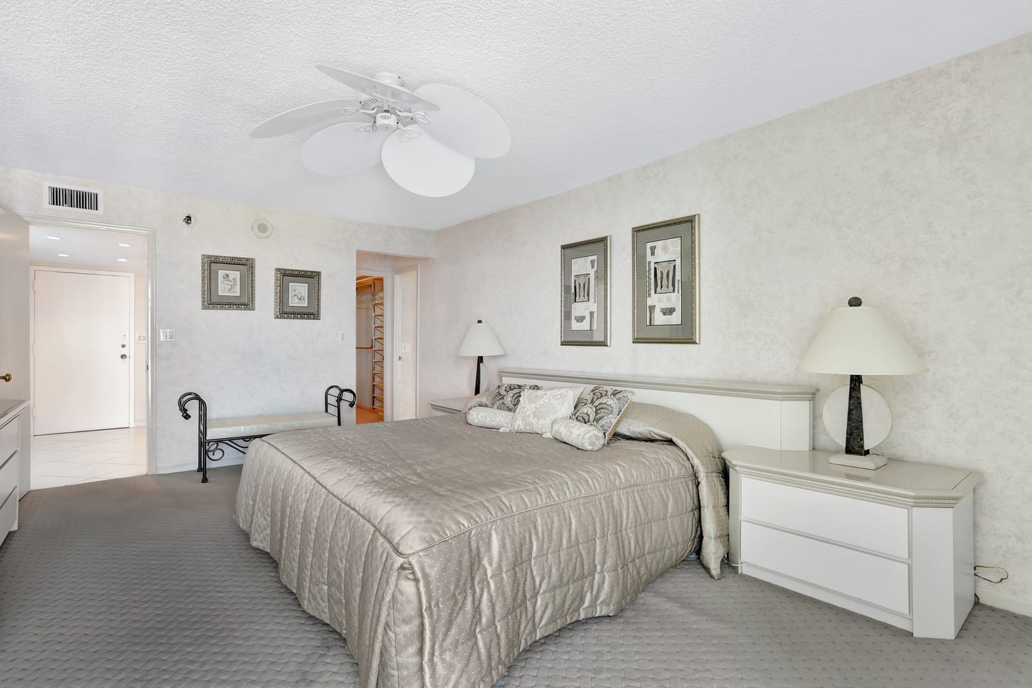 The split bedroom layout offers privacy and flexibility. The guest bedroom features a large walk-in closet, and its own full bathroom adorned with rich pristine marble tile that’s still a trend today. A quick update with a frameless shower door and a modern vanity could take it to the next level. The primary suite is a showstopper, offering direct ocean views with a beautiful en-suite bathroom with high-end large marble tile. Dual closets, including a generous walk-in, provide ample storage.