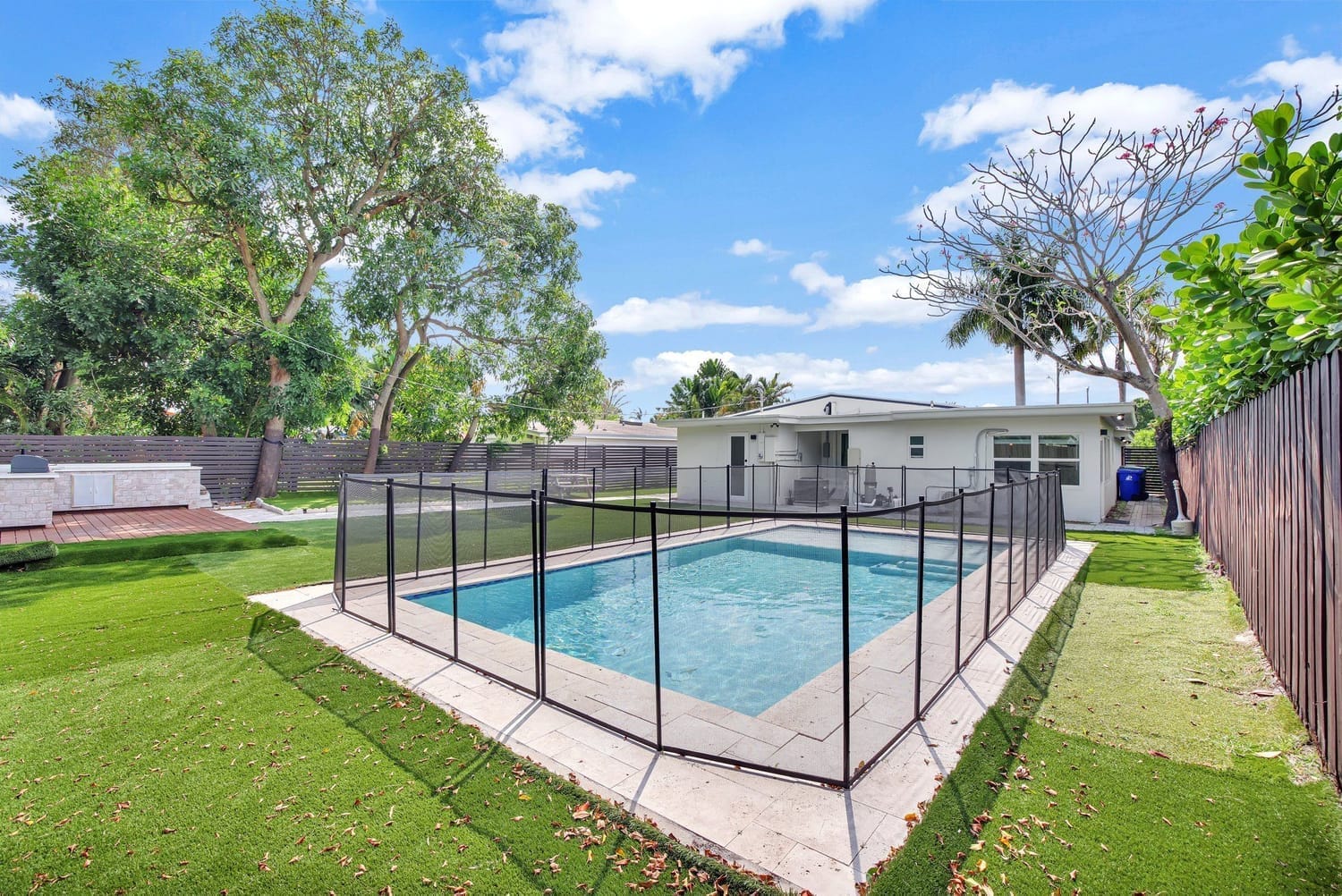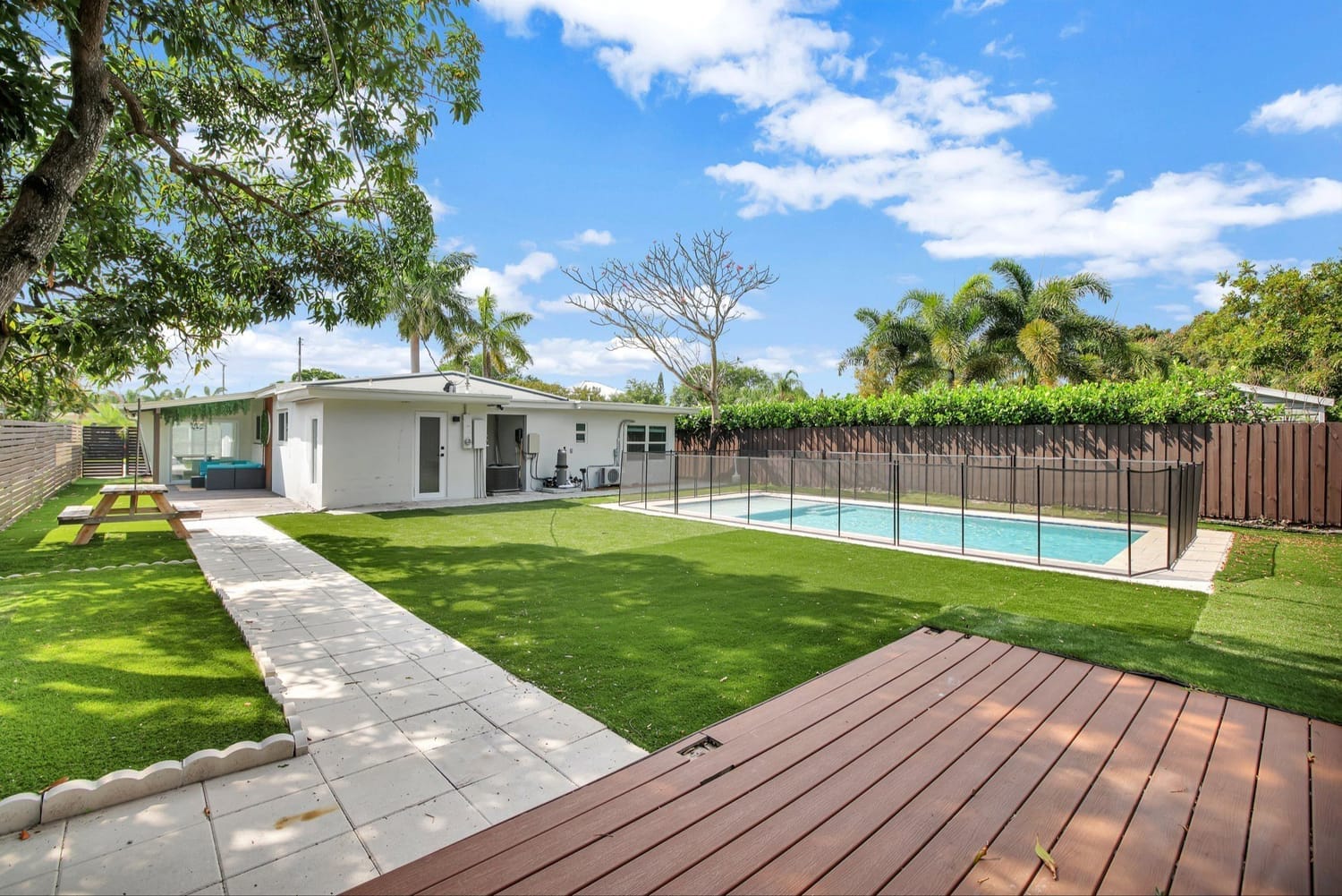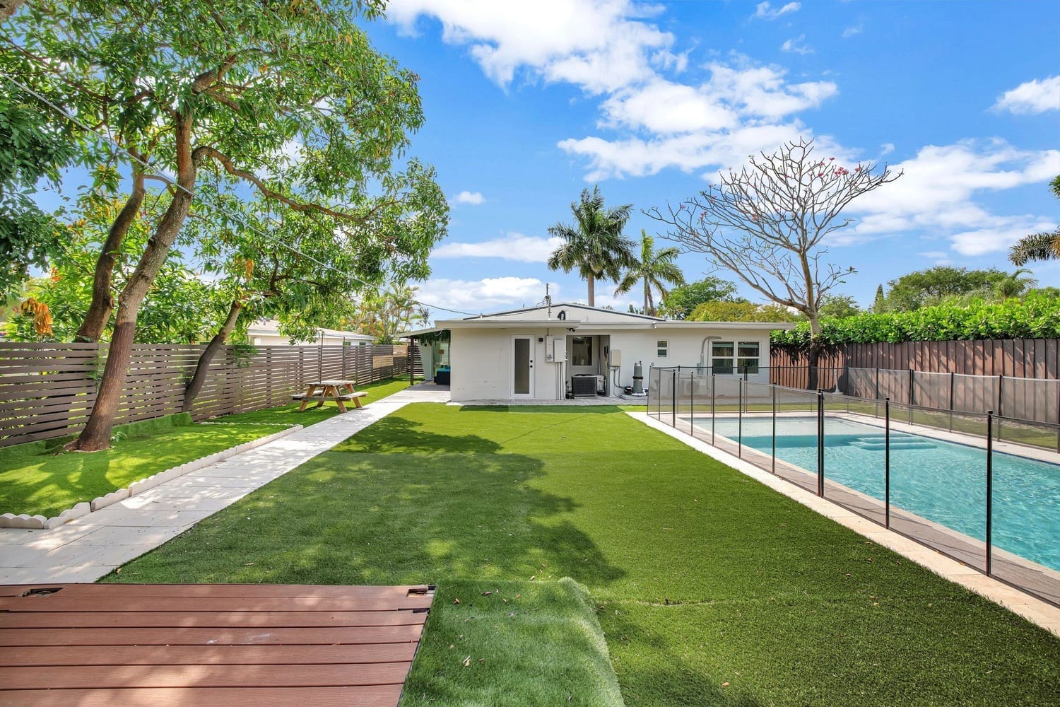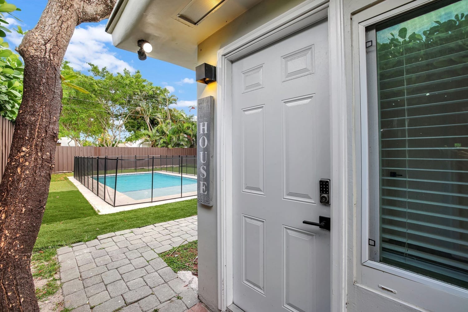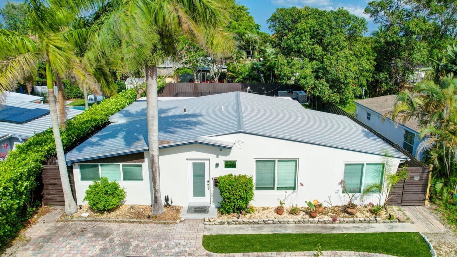Introducing one of the largest homes in the sought-after Poinsettia Heights neighborhood! This stunning 4-bedroom, 3-bathroom residence has undergone a complete renovation, boasting brand new kitchen and bathrooms, along with a sparkling NEW pool. Enjoy the peace of mind provided by the new AC system and a durable aluminum roof with an impressive lifespan of 50 years. Hurricane impacts windows and doors throughout. Primary bathroom includes a luxurious freestanding bathtub, a separate waterfall shower head, and a sleek floating vanity adorned with contemporary finishes. A unique feature of this home is its full 1-bedroom, 1-bathroom private suite with a separate entrance and its own kitchen, perfect for guests or extended family members.